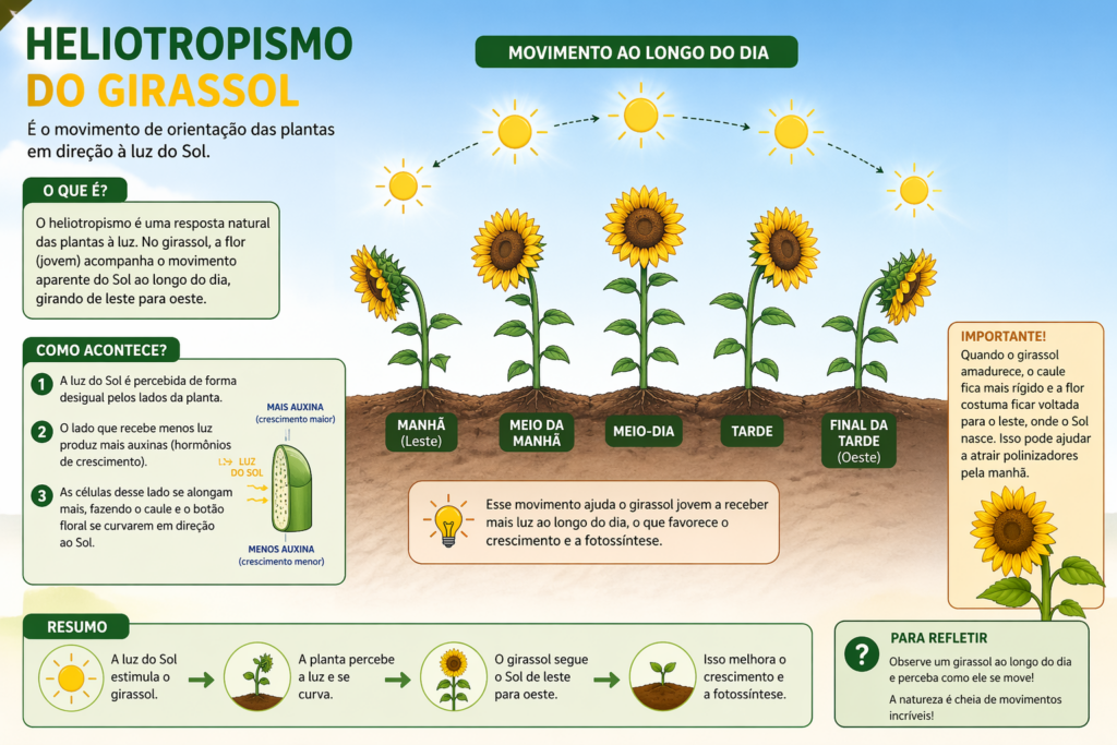 Muita gente acredita que o girassol passa a vida inteira virando o pescoço de um lado para o outro. No entanto, a ciência explica que o famoso heliotropismo (o movimento de seguir o sol do leste ao oeste) acontece apenas enquanto a planta é jovem.