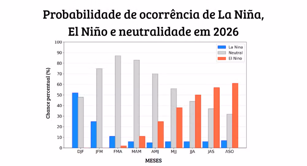 O gráfico ilustra a queda da neutralidade climática e a consolidação do El Niño (barras vermelhas) a partir do segundo semestre, sinalizando um período de maior instabilidade e riscos para o agronegócio brasileiro.